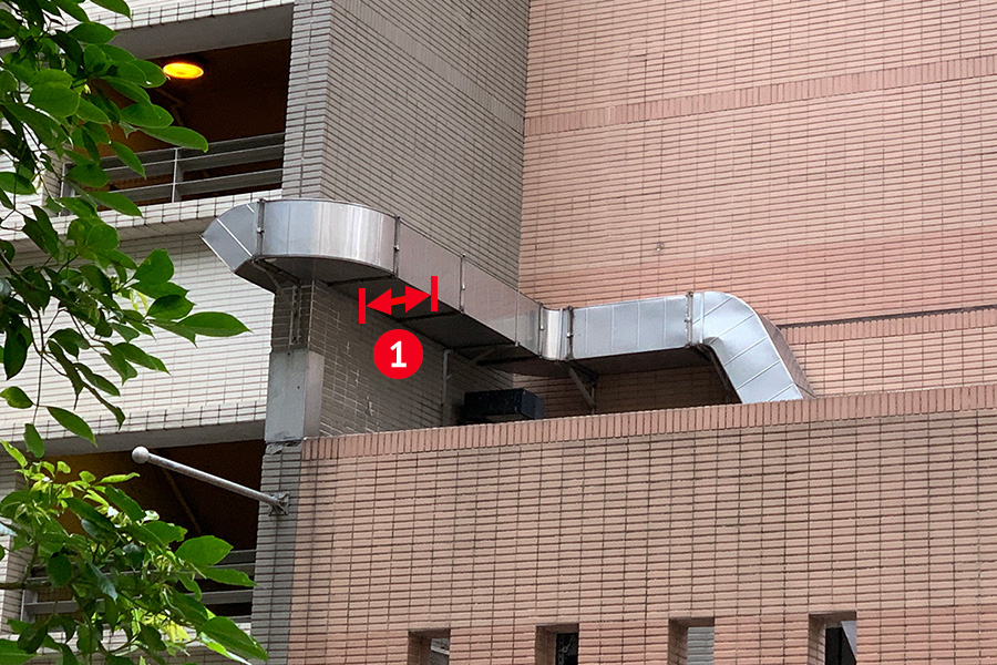 | If the duct or frame projects from the external wall of a building or from a fence wall on-grade | No part of the duct or frame projects more than 750mm |