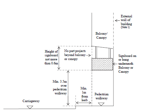Positional requirements of signboards on or hung underneath balcony or canopy
