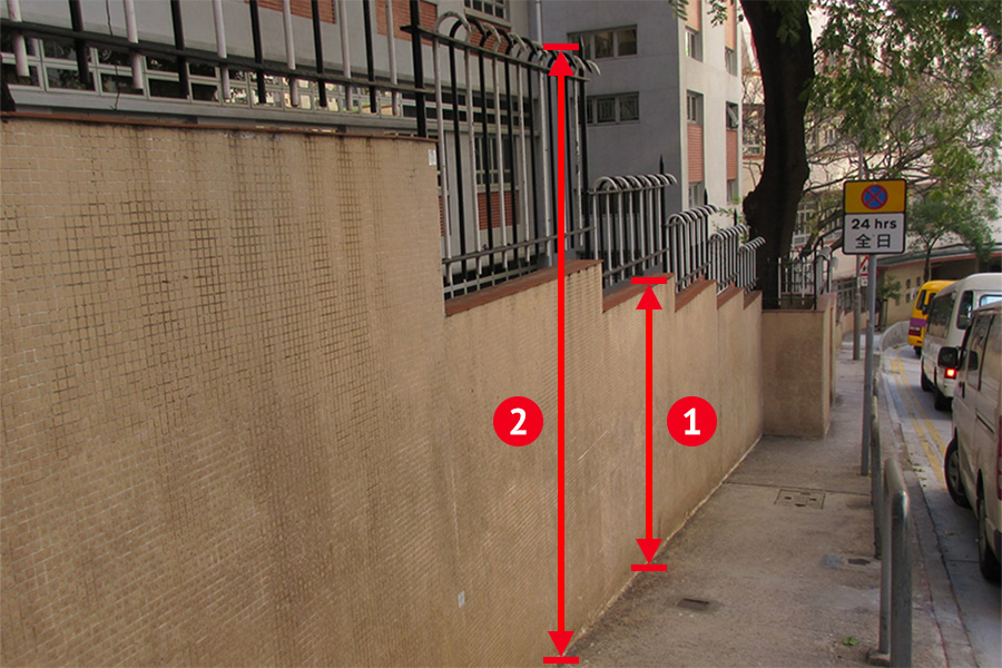 | 該網欄、欄杆或支柱的位置 | 位於地面上的實心圍牆(不包括違例實心圍牆及符合以下說明的實心圍牆:屬附表2第2部第5項所描述者,並在沒有本條例第14(1)條所指的建築事務監督的批准及同意下豎設、改動或修葺)(圍牆)的頂部 |