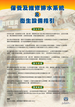 本署鼓勵樓宇業主、業主立案法團或樓宇的管理及維修人員定期視察樓宇的排水系統或衞生設備,以確保排水系統或衞生設備得到妥善保養和保持正常運作。有鑑於此,屋宇署已出版「保養及維修排水系統及衞生設備指引」以協助業主,指引可於屋宇署辦事處索取,或於以下網址下載