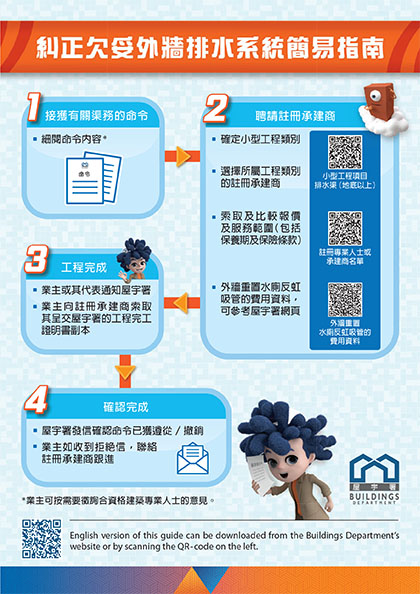 如發現私人樓宇的排水系統欠妥、不足或不衞生,建築事務監督會根據《建築物條例》(第123章)第28條,向有關業主送達命令,要求業主在一段時間內進行勘測及/或修葺工程。只有在緊急情況下或業主不遵從命令時,屋宇署才會代他進行工程,然後向他收回工程的費用,另加監督費及附加費。以下是完成維修的部分個案。