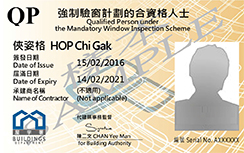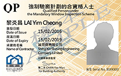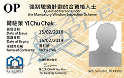 驗窗卡載有合資格人士的姓名及近照、簽發日期、屆滿日期及承建商名稱(認可人士/註冊結構工程師/註冊檢驗人員除外)。