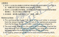 如持卡人已從有關名冊內刪除、或已辭職或不再獲委任為註冊承建商的獲授權簽署人,須立即交還驗窗卡予屋宇署。