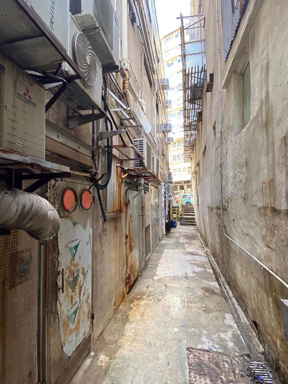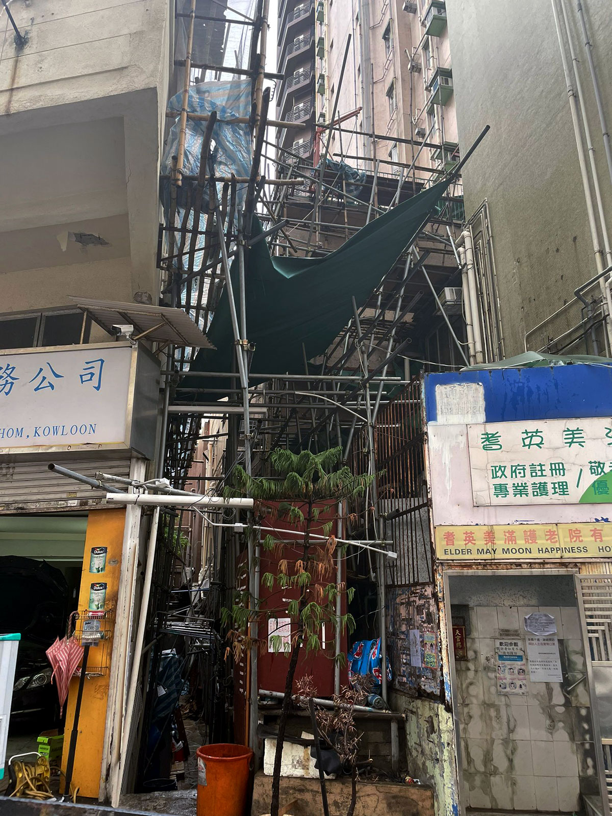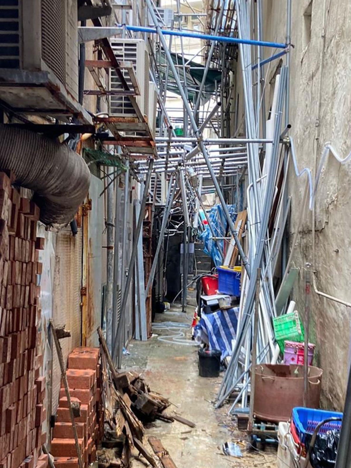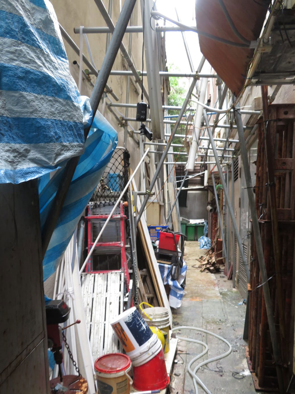 屋宇署早前接獲市民舉報,指有人在上址後巷豎設大型棚架。屋宇署派員視察發現有關棚架除了豎設於私人後巷,部分亦豎設在政府土地,遂把個案通報地政總署作同步跟進。